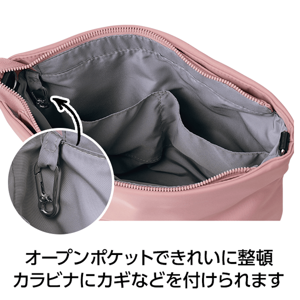 • 仕様/開閉:ファスナー式 ショルダー:長さ調節可・取り外し可 前面:ファスナーポケット 中面:オープンポケット×2 カラビナ付き(取り外し可)