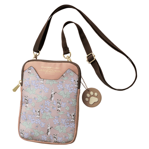猫好きさんが運命の猫本に出会える「神保町にゃんこ堂」コラボの、スマホが入るミニショルダー。猫耳を表現した前面のマグネット付きポケットに、繊細なフラワーのなかで遊んでいる猫が可愛らしい、大人も気兼ねなく持てるデザインです。オープンポケットだからスマホやハンカチ、ICカードなど取り出し頻度の高いアイテムをひとまとめにできて使い勝手抜群。ぷにっとした肉球マークの取り外し可能なチャーム付き。