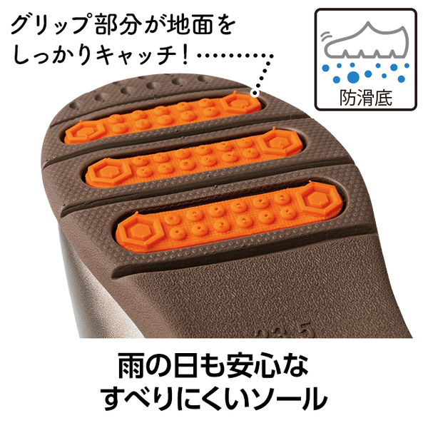 突然の雨の日も快適・安心。滑りやすい濡れた路面で大きな効果を発揮する、グリップパーツ入り防滑底のスリッポン。取り外し可能な歩きやすい高反発インソールに、アッパー部分ははっ水加工だから晴れの日も雨の日もデイリーに活躍してくれます。普段使いにぴったりの、コーデに合わせやすい上品シンプルなデザインも魅力的。履き口広めで足入れしやすく、かがまずにすぽっと脱ぎ履きできるラクチンデイリーシューズです。