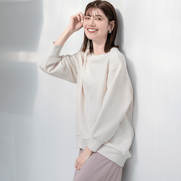 ふっくら厚みのあるジャージー素材のプルオーバーは立体的なふんわりシルエットで、着るだけでサマになるこなれた大人カジュアルに。後ろ下がりの裾丈で体型カバー効果も狙えます。