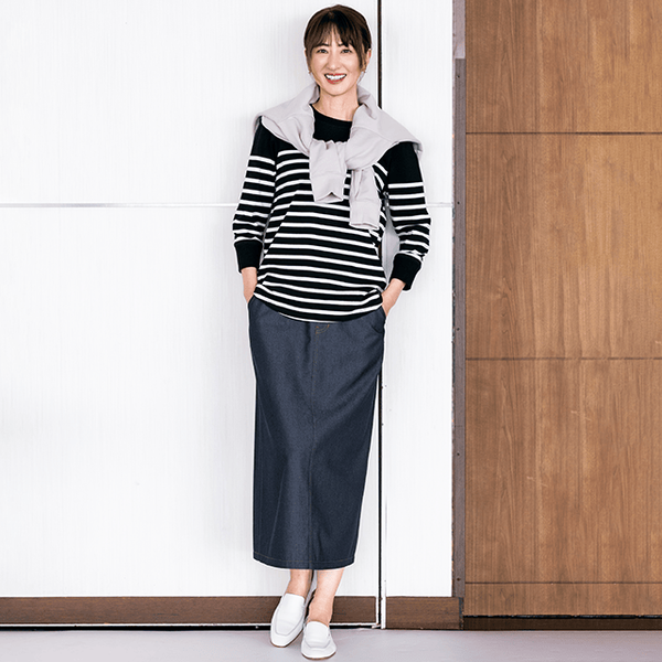 台形のミディ丈はトップスを選ばず着回しできる