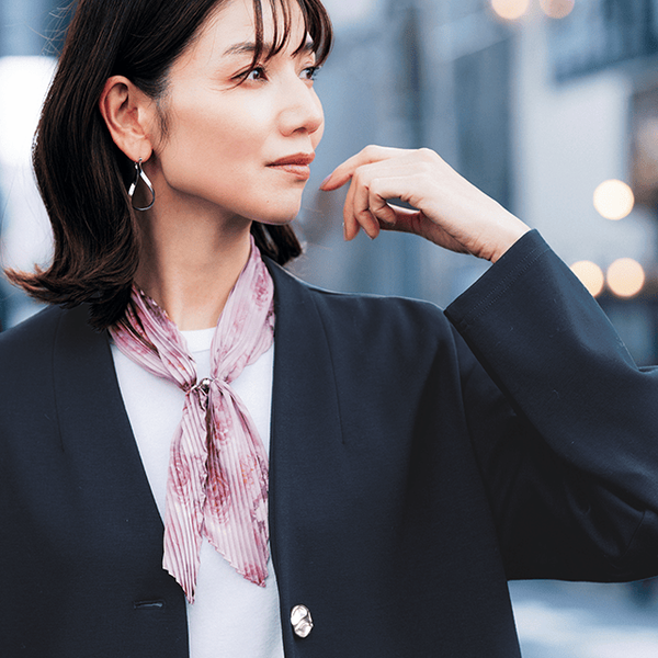 マグネット式でさっと装着かんたん!コンパクトサイズなのでアウターやブラウスにも合わせやすく、コーデになじみやすいカラー展開のミニスカーフ。水彩で描いたような淡いフラワー柄と立体的なプリーツが、寂しい首元に華やかさをプラスし顔映えさせます。