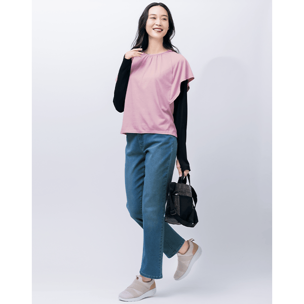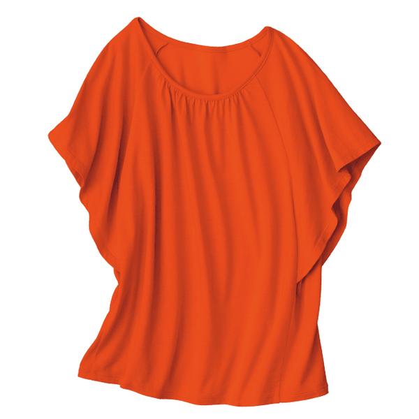 吸水速乾機能でいつでもさらっと涼やかな、フレアスリーブのカットソー。流れるドレープが着やせ効果抜群で、フレアスリーブが二の腕も隠してすっきりと見せてくれます。吸水速乾性に優れたオリジナルの生地「スピンエアー®」でいつもさらさら快適。脇はマチ付きで下着が見えずに安心です。