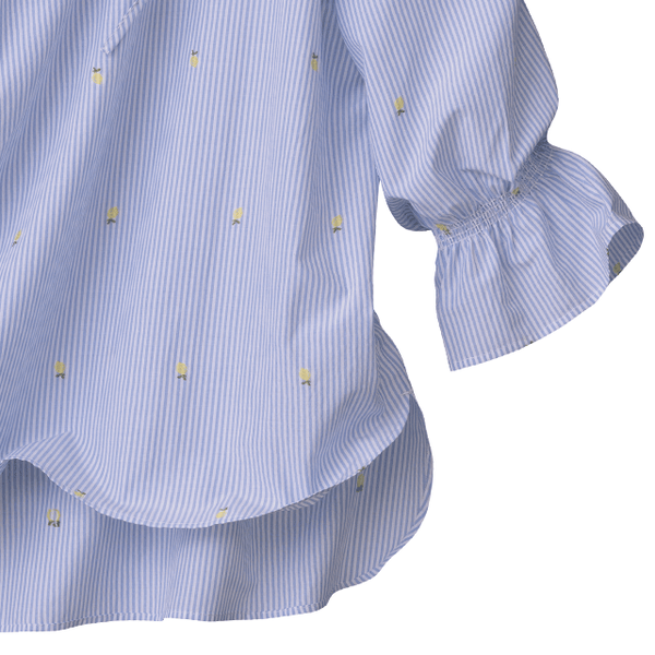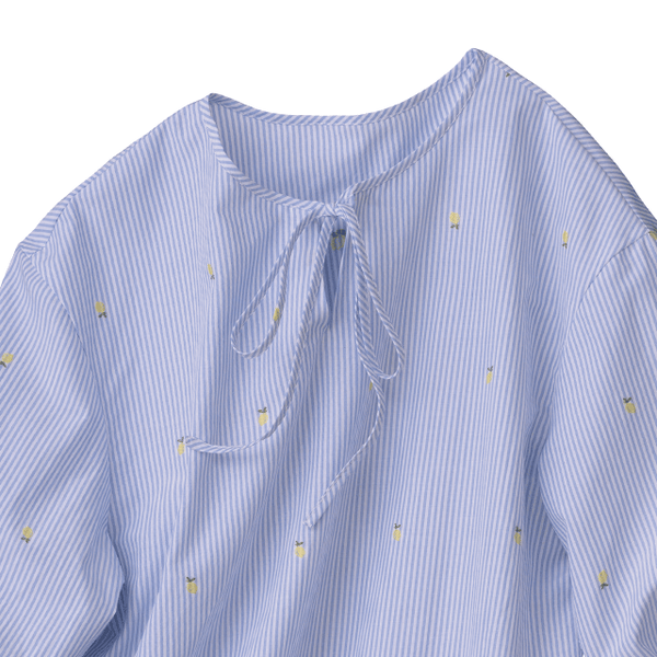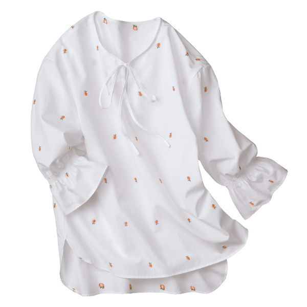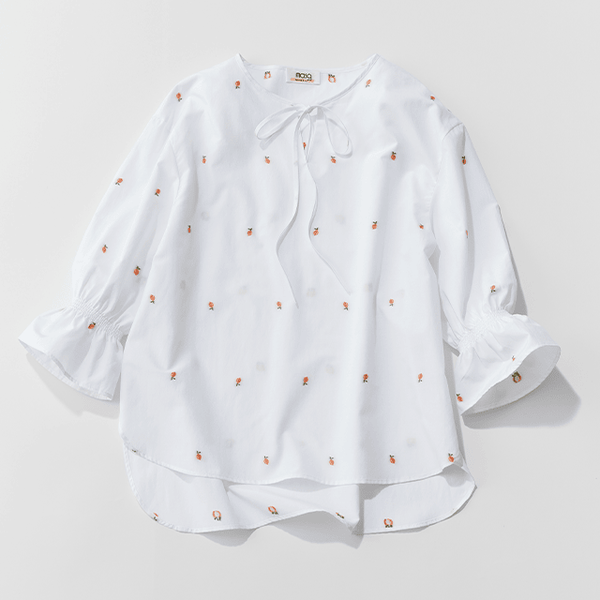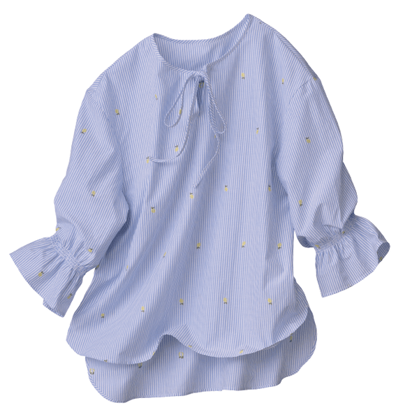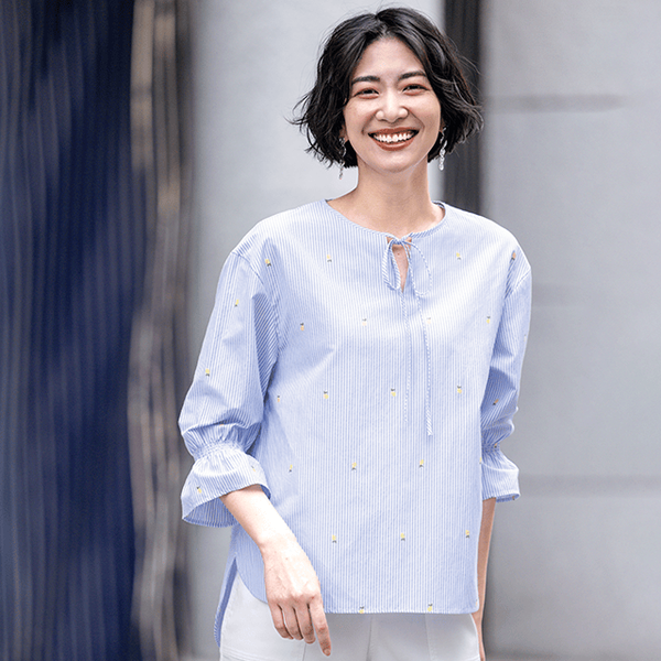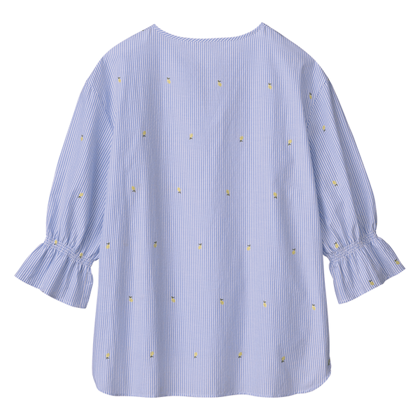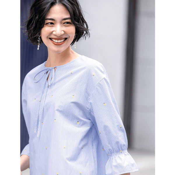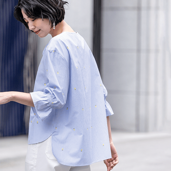 トルコ有数の歴史ある繊維産地、ブルサで生産されたテキスタイル。刺繡のようなレモン柄ジャカードで柔らかく上質なシャツ生地です。被りタイプのブラウスなのでほどよくゆとりがあります。袖口はゴム入りですが、ゆったりした設計です。胸元のあきがさりげない抜け感をつくってくれます。