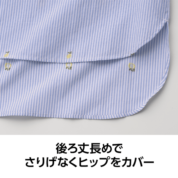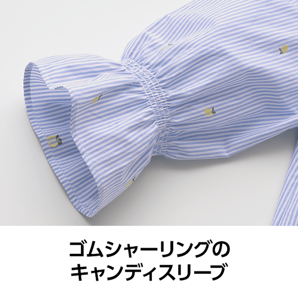 レモン柄のジャカードが可愛らしく並んだ薄手のシャツ地です。伸縮はありませんが、ゆとりが多いデザインなので、Sサイズで良いです。袖口のゴムもしめつけを感じない優しい作りです。プリント柄ではなく、ジャカードという価値とトレンドを感じる女性らしいデザインです。
