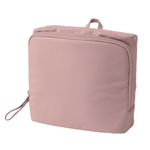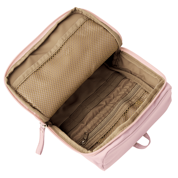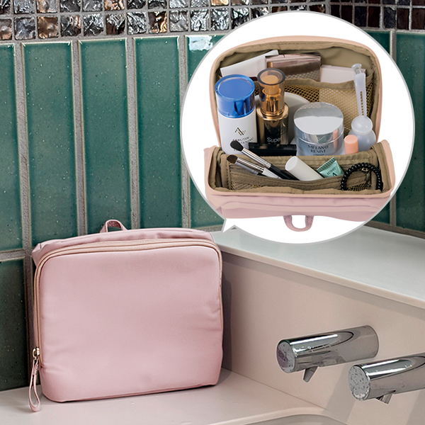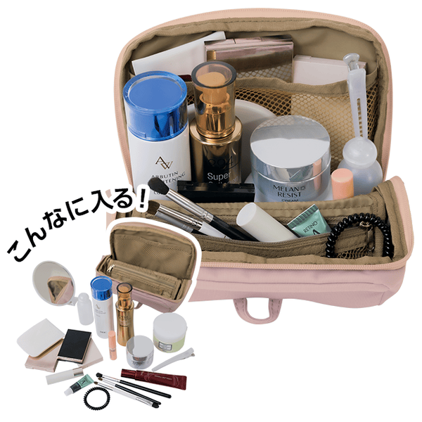 洗面用品やコスメなど、旅行や生活の必需品をイッキに収納できるオールインワンなポーチ。開いたまま自立するので中身が見えて使いやすく、はっ水加工付きで洗面台に置いても安心です。