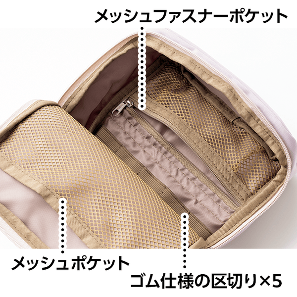 • 仕様/開閉:ファスナー式 中面:メッシュポケット・メッシュファスナーポケット・ゴム仕様の区切り×5