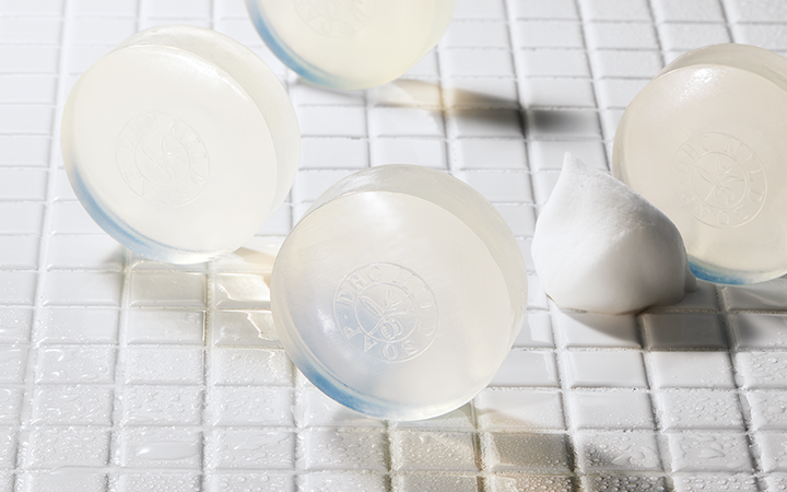 マイルドソープの透明度はこだわりの証。熟成の過程で成分を濁らせない高い技術で品質を守ります。昔ながらの枠練り製法で、熟練のスタッフが2カ月以上かけて作るソープは、最後にひとつひとつていねいに磨きあげられて完成します。