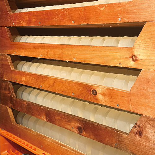 小切りしたソープを木製のすのこに並べ、60日ほど熟成させます。ソープはとてもデリケートで、熟成期間が一日違うだけで、仕上がりがまったく異なることも。一年を通して均一な仕上がりを保つため、人の目によるこまめなチェックがかかせません。