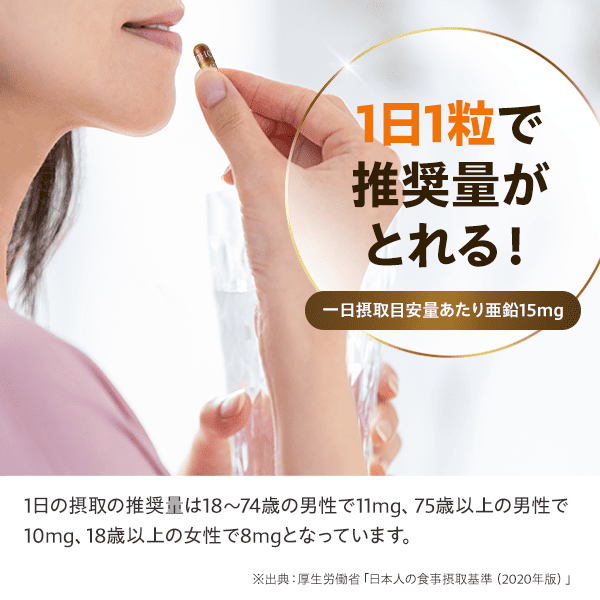 - ●亜鉛は、たんぱく質・核酸の代謝に関与して、健康の維持に役立つ栄養素です。