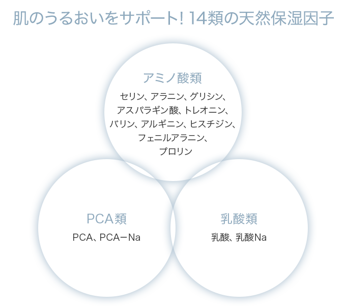 天然保湿因子(NMF)とは、肌に本来備わっているアミノ酸類などの保湿成分のこと。このNMFの量が角質で減少すると、肌の保湿機能が低下し、乾燥しやすくなります。『DHC PAナノコロイドミスト』には、プラチナシルバーシリーズの中で唯一、14種類の天然保湿因子を配合。乾きがちな肌をしっかりうるおし、使うたびにみずみずしく輝く肌へと導きます。