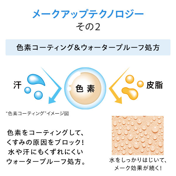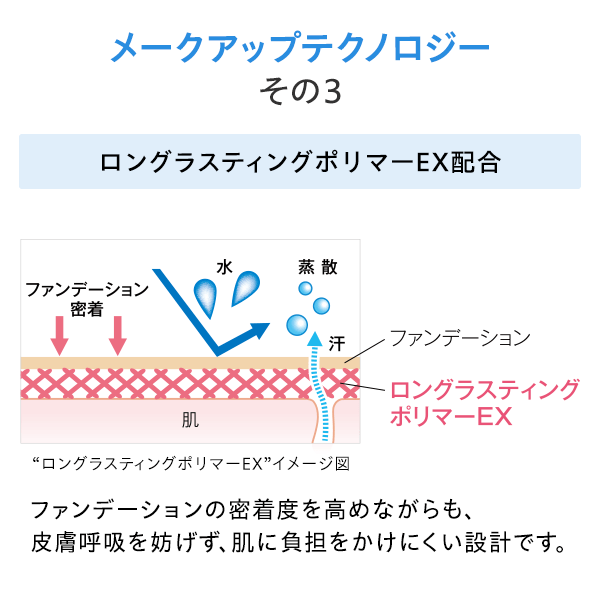 また、“ロングラスティングポリマー”を当社従来品より増量することにより、ファンデーションの肌への密着度、持続性がさらに高まりました。