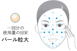- ●のポイントにカラーベースをのせた後、→の要領で顔の中心から外側に向かってやさしくのばし、肌になじませます。