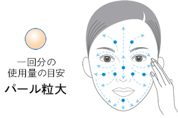 - ●のポイントにファンデーションをのせた後、→の要領で顔の中心から外側に向かってやさしくのばし、肌になじませます。