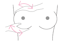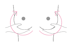 1. バストの内側を下から上へワキの方へ向かってさすり上げます。親指以外の4本の指を使います。