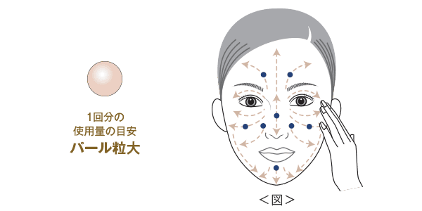 - ●のポイントにカラーベースをのせた後、→の要領で顔の中心から外側に向かってやさしくのばし、肌になじませます<図>。