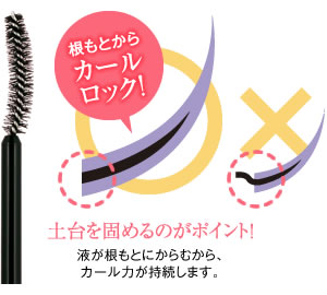 まつ毛の根もとにマスカラ液がついていないと、重みでまつ毛が下がりがちです。マスカラ液を根もとからしっかり絡めるのが、カール力を左右するポイントです。