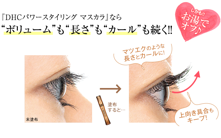 『DHCパワースタイリング マスカラ』は、お湯で簡単に落とせるフィルムタイプながら、印象的な瞳に必要なまつ毛の「ボリューム」「長さ」「上向きカール力」「持続力」すべてをこれ1本で演出します。