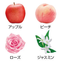 アップルやピーチといったジューシーでみずみずしいフルーツの香りに、ローズ、ジャスミンといった女性らしい優雅な花々の香りが調和。さらに、ウッディ・アンバー・ムスクが爽やかな奥行きを演出するフルーティブーケの香りです。甘く、華やかな香りに包まれながら、ハッピーな気分でヘアケア&スタイリングができます。