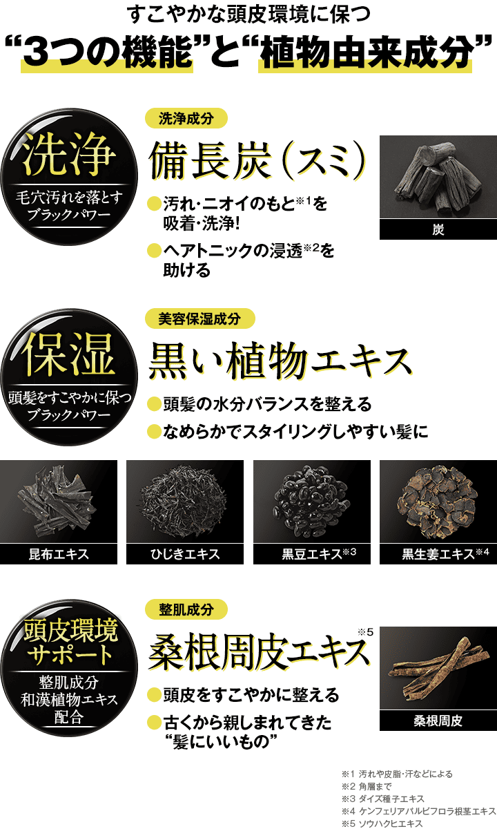 洗浄成分には、吸着と洗浄にすぐれ、ニオイの原因にもなる毛穴汚れをすっきり落とす「備長炭」。頭髪の水分バランスを保つ保湿成分として、昆布、ひじき、黒豆※3、黒生姜※4の「黒い植物エキス」。すこやかな頭皮環境をサポートする成分として「桑根周皮エキス※5」を配合しました。頭皮を優しく、でも、皮脂まですっきり洗いあげながら、スタイリングしやすい、なめらかな髪に導きます。
