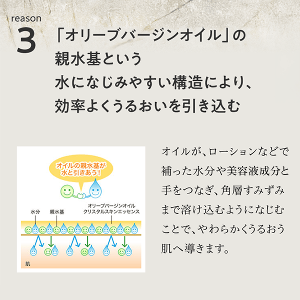 『DHCオリーブバージンオイル』ならではの「親水基」という水になじみやすい構造により、オイルがローションなどで補った水分や美肌成分と手をつなぎ、角層すみずみまで溶け込むように浸透。やわらかくうるおう肌へ導きます。