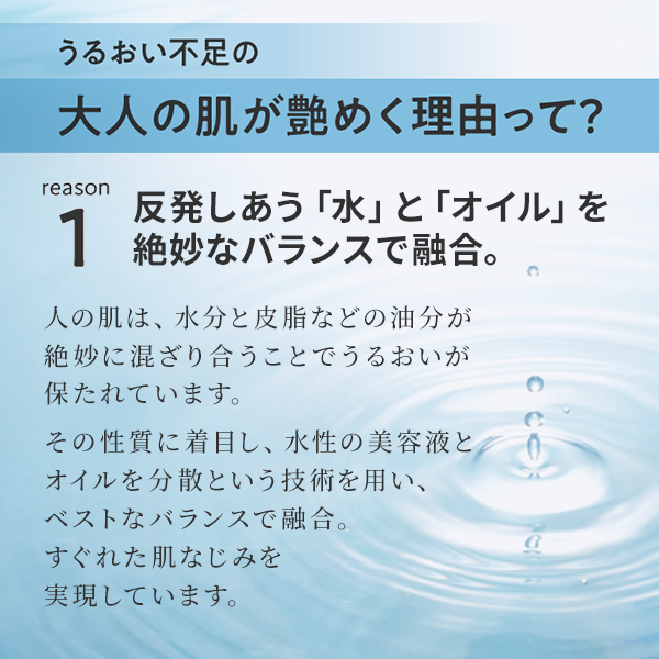 その性質に着目し、水性の美容液にオイルを分散させるという技術を用いて、独自のバランスで融合。