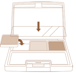 アイシャドウの中皿をコンパクトにはめ込み、上から軽く押さえてください。セットする際、透明フィルムは捨てずに、アイシャドウ表面にのせた状態で保管してください。