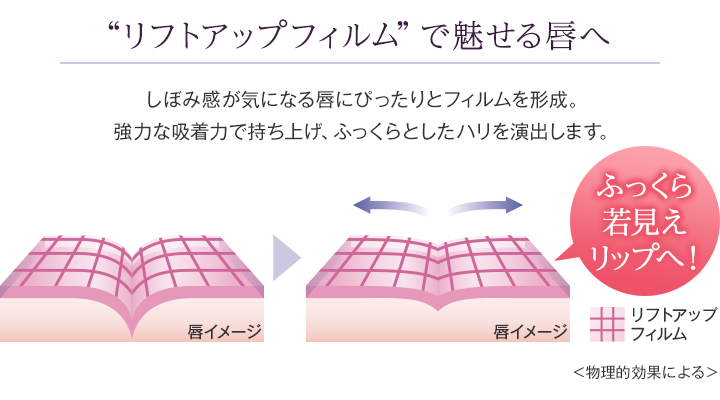 さらに、唇にフィットして縦ジワをぐっと持ち上げる「リフトアップフィルム」を配合。ひと塗りで、なめらかでハリのある唇に仕上げます。