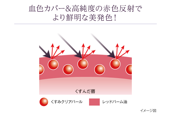 赤色をより鮮やかに演出し、年齢印象をカバーする美発色を実現するため、天然の赤色色素によるカラーコントロール効果もある保湿成分「レッドパーム油」に、純度の高い赤色反射光をもつ「くすみクリア※1パール」を配合しました。年齢とともにくすみがちな唇を自然にカバーし、いきいきと若々しい印象へ導きます。さらに、顔料を微細処理することで、顔料によるにごりやくもり、暗さを抑えた鮮明な発色を実現し、明るく色鮮やかな唇を演出します。