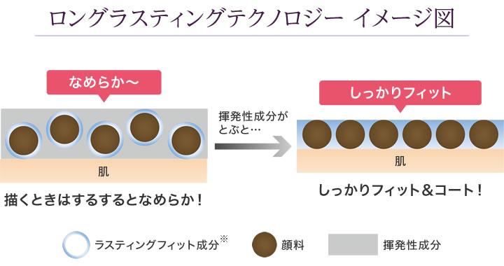 密着感と持続力を同時に叶える、いいとこどりの揮発タイプペンシルを採用。揮発性成分がとぶことで、顔料が肌にしっかりと定着し、汗・皮脂・摩擦に強いロングラスティング力を実現しました。さらに、ペンシル・パウダーともに配合されたラスティングフィット成分※が、仕上げたての美しさを長時間キープします。