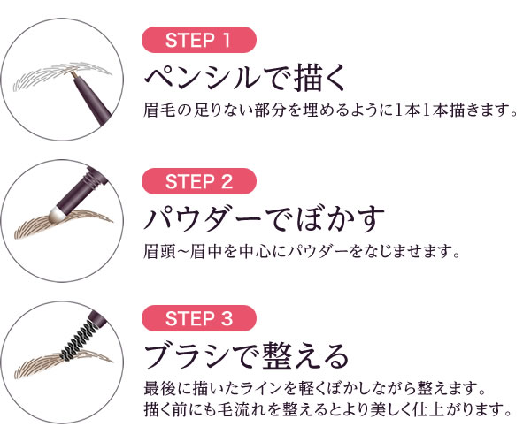 なめらかに描けるペンシル、自然にぼかせるパウダーチップ、全体を整えるスクリューブラシ、3つの機能が1本に! 描く・ぼかす・整えるの3ステップで、ふんわりと立体感ある美眉が完成します。