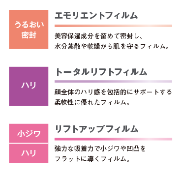 強力な吸着力で小ジワや凹凸をフラットに整えるリフトアップフィルム、全体のハリ感を包括的にサポートする柔軟性に優れたトータルリフトフィルム、うるおいを留めて密封するエモリエントフィルムの3層構造によるトリプルフィルムテクノロジーを採用。うるおいを逃さず崩れにくい化粧膜を実現し、明るいハリ艶美肌が長時間持続します。