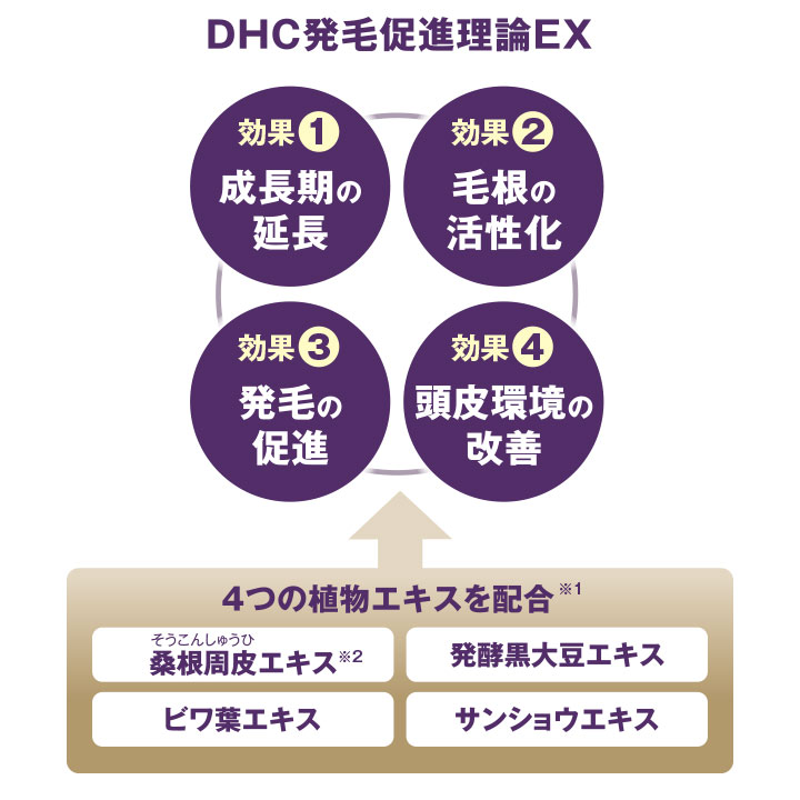 「成長期の延長」「毛根の活性化」「発毛の促進」「頭皮環境の改善」の4つの効果で発毛促進・育毛へ効率よくアプローチする<DHC発毛促進理論EX>を採用。この理論に基づいて配合された4種の有効成分と4種の植物エキスが、毛髪を長くとどめ、根強く育てて、頭皮をすこやかに整えます。