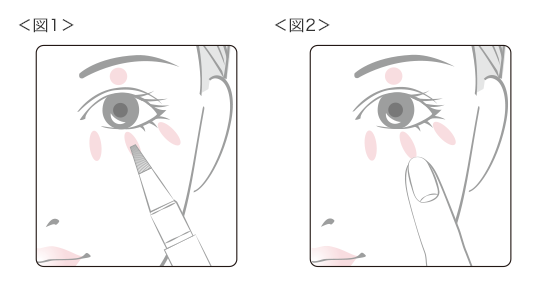 手の甲などで筆先に液をなじませた後、気になる部分に直接塗布し<図1>、指先でやさしくたたきこむようになじませます<図2>。
