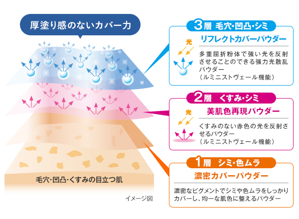 カバーしながらも厚塗りにみせない3層パウダー