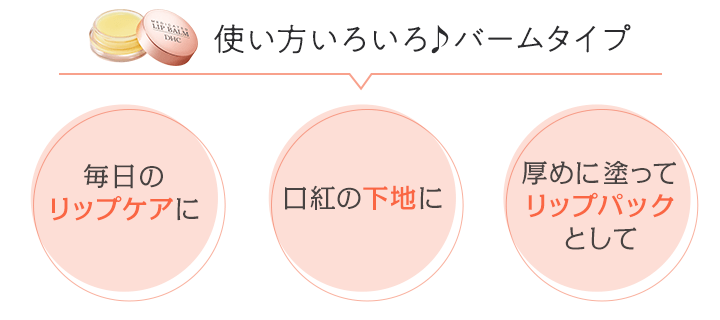 荒れをくり返しがちなときや、日中ケアしにくい唇のキワ、縦ジワなどに、厚めに塗ってリップパックとしてご使用いただけます。