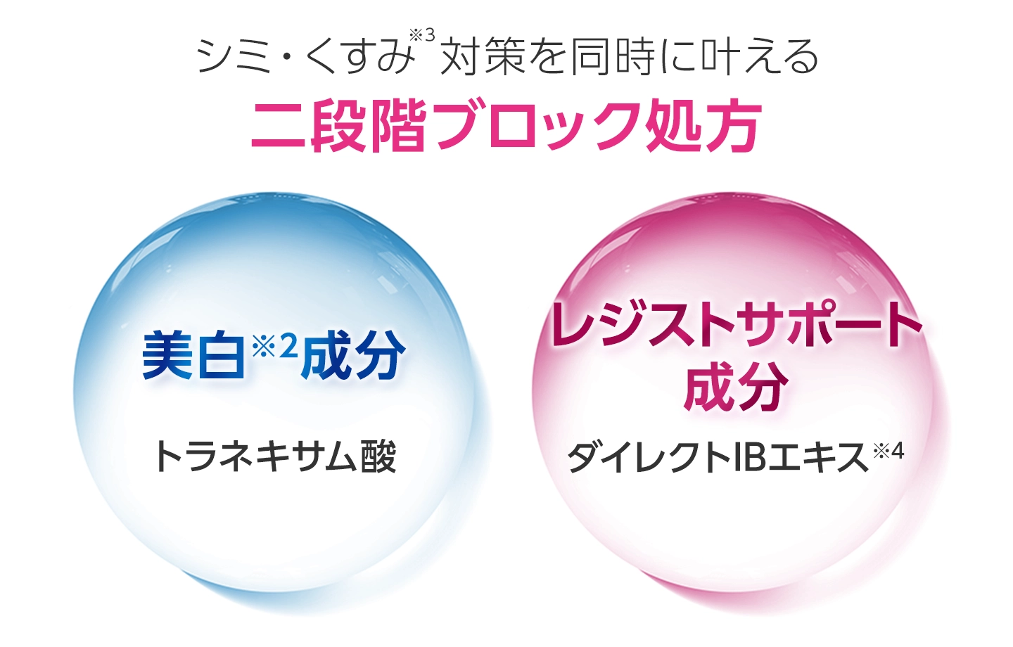 美白有効成分トラネキサム酸と、レジストサポート成分「ダイレクトIBエキス※4」を配合した「二段階ブロック処方」を採用。シミ・そばかすを防ぎながら、明るい肌印象に導きます。