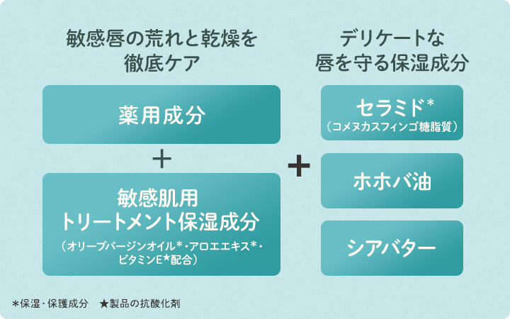 敏感肌の唇の荒れや乾燥、ひび割れを防ぎ、ふっくらとみずみずしい状態に整えます。