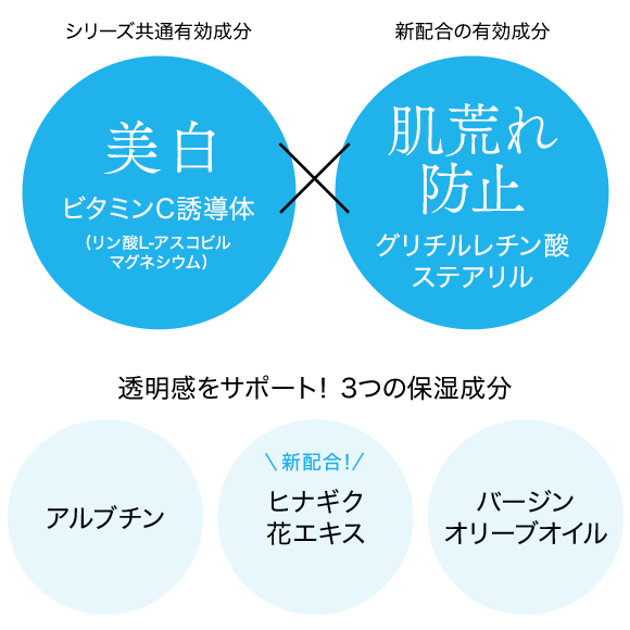 シリーズ共通の美白有効成分に加えて、肌荒れ防止有効成分をプラスしたダブルの有効成分処方です。