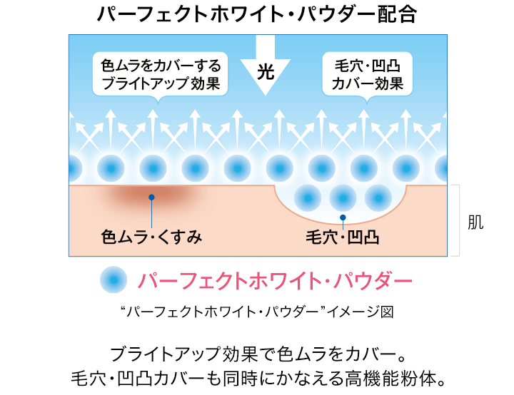 高い光拡散性で、シミ・そばかす・くすみなどの色ムラをカバーし、ワントーン明るい肌に仕上げる“パーフェクトホワイト・パウダー”を配合。肌に自然な明るさをプラスします。また、毛穴などの凹凸に入り込み、ぴったりフィットするため、なめらかな肌に仕上がります。