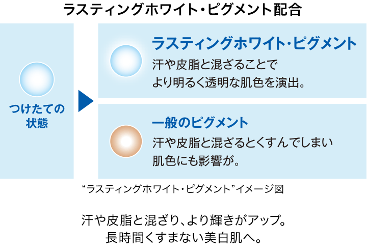 さらに、汗や皮脂と混ざることで、より輝きが増す“ラスティングホワイト・ピグメント”を配合。長時間経ってもくすみにくく、美白肌をサポートします。