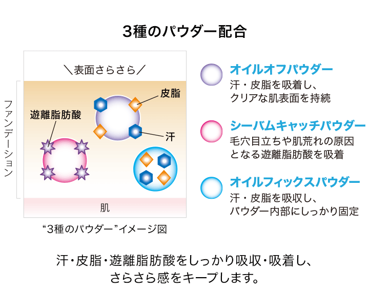 化粧くずれにアプローチする、3種のパウダー(オイルオフパウダー、シーバムキャッチパウダー、オイルフィックスパウダー)を配合。過剰な汗や皮脂を吸収してテカリやべたつきを抑え、毛穴目立ちや肌荒れの原因となる遊離脂肪酸を選択的に吸着することにより、さらさらの状態をキープします。
