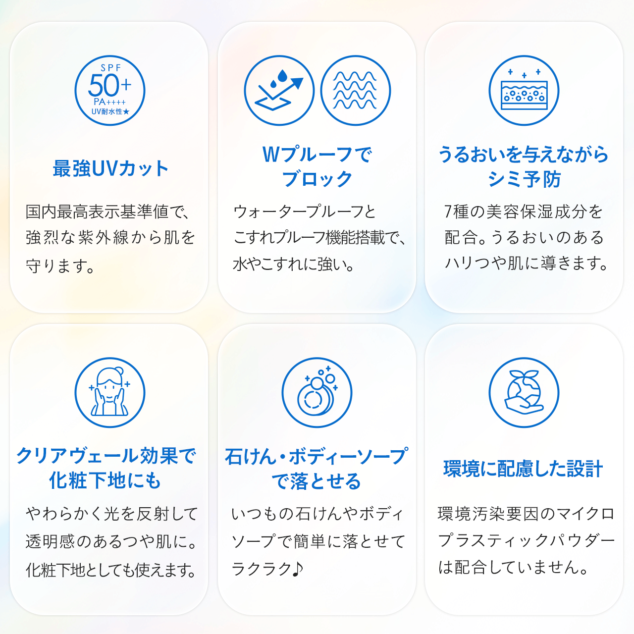 さらさらパウダーを含んだうるおいたっぷりジェルが、す~っとなめらかになじんで、ベタつくことなく、サラッとした軽やかさをキープ。気になる白浮きや日やけ止め特有のにおいもないので、日やけ止めが苦手な方も快適にお使いいただけます。さらにお使いの石けんやボディソープで簡単に落とせます。