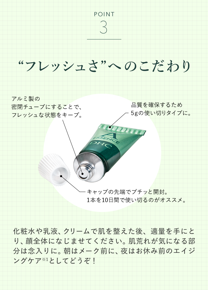 顔全体へはもちろん、エイジングサイン※5が出やすく皮膚が薄いデリケートなパーツへのポイント使いもOK!ゴワつきやキメを整え、やわらかな肌へとアプローチします。