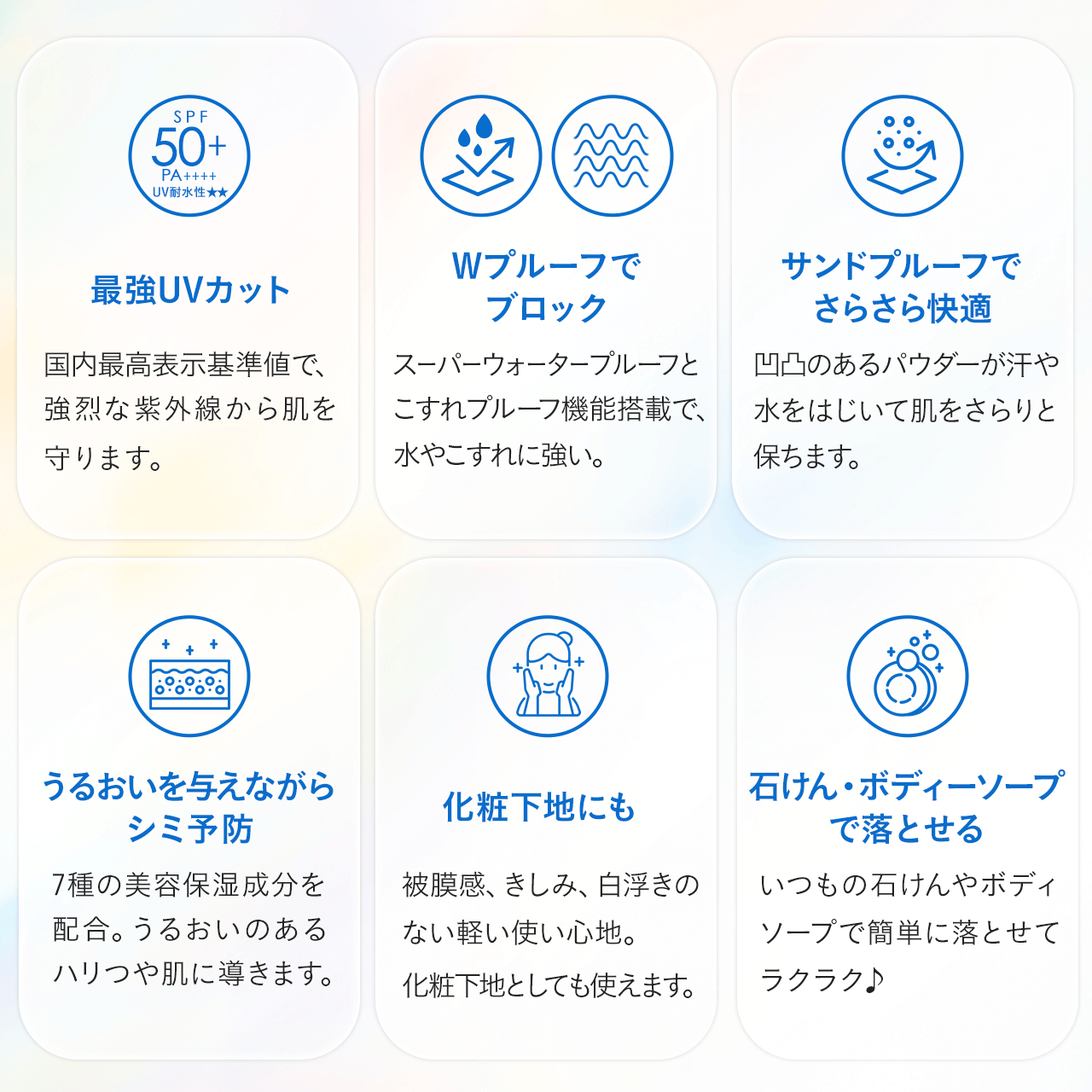 汗や水に強い「スーパーウォータープルーフ」、ベタつかない「サンドプルーフ」、バッグや衣類などの摩擦でも落ちにくい「こすれプルーフ」の3つのマルチプルーフを搭載。デイリー使いはもちろん、炎天下でのスポーツやレジャーにもおすすめです。
