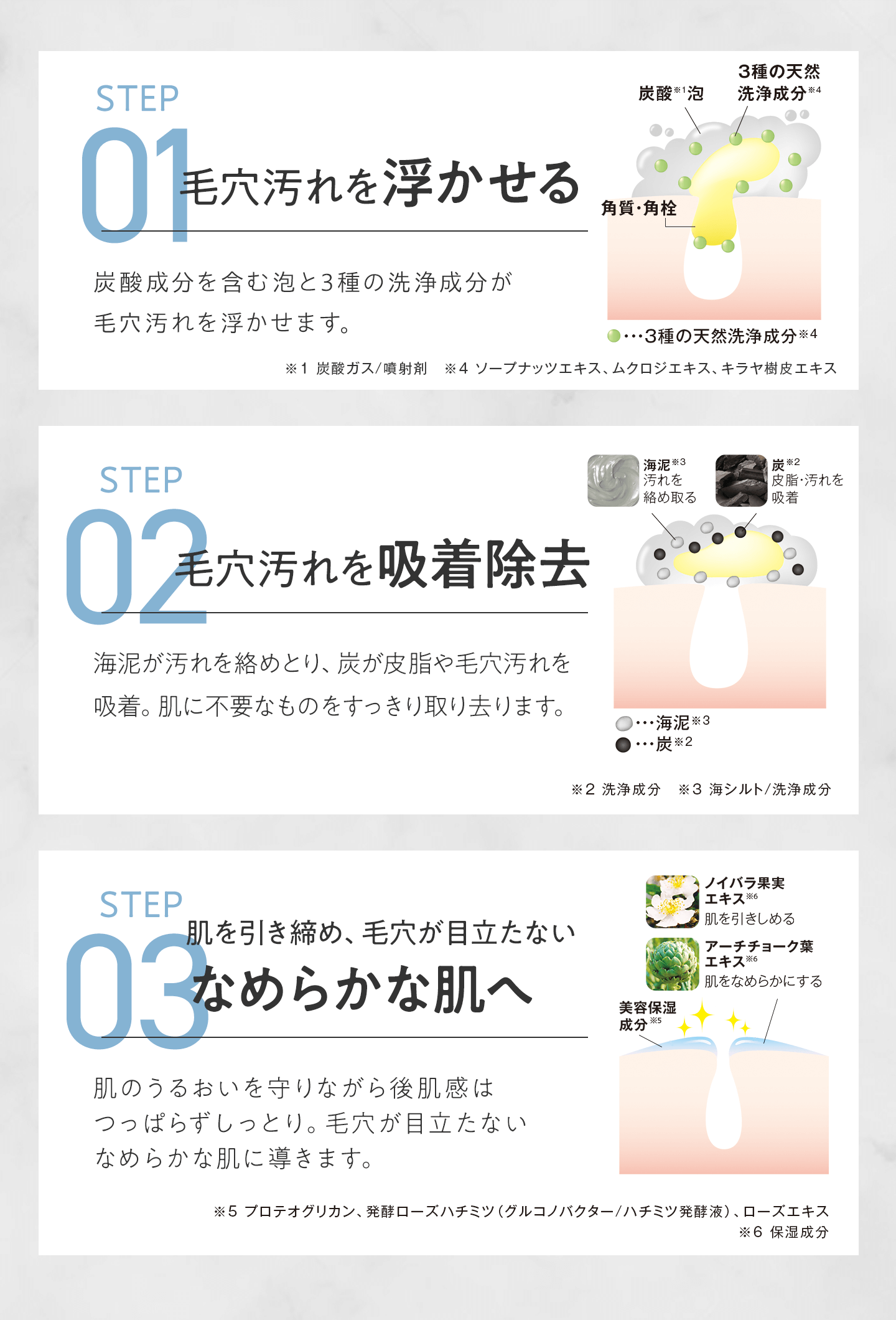 - ※泡に含まれるガスにより、ピリピリ等の刺激を感じることがあります。洗い流せばおさまりますが、お肌に合わないときは使用を中止してください。