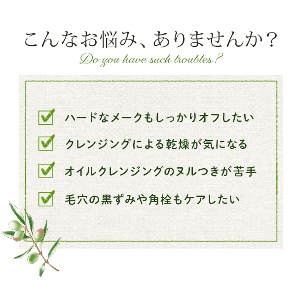 • ※クレンジングオイルの色調は、オリーブ果実の収穫時によって異なる場合がありますが、品質に問題はありません。