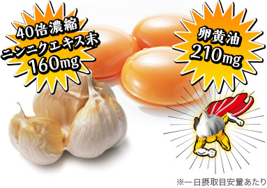 ニンニク独特のニオイのもととなる成分アリインと、卵黄に含まれ、乳化の働きにすぐれる健康成分レシチンが相乗的に働いて、タフで健康な毎日をサポート。ソフトカプセルなので、いつでも手軽にお召し上がりいただけます。