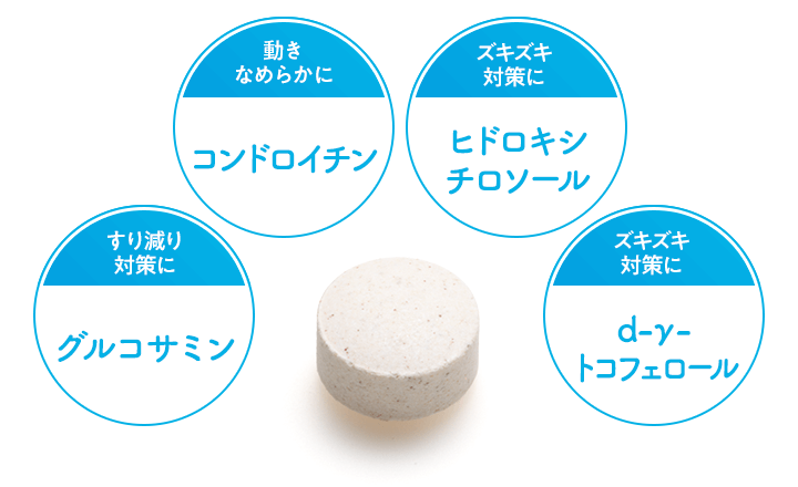 DHCでは、すり減りやすい軟骨を構成する成分がまとめて摂れるように、天然由来のグルコサミンとコンドロイチンをダブルで配合しています。さらにヒドロキシチロソールとγトコフェロールが「痛い!」といえないワンちゃんを強力にサポート!DHCの独自処方でワンちゃんの関節の健康を維持します。