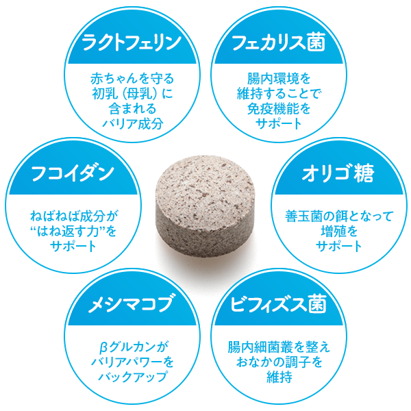 ビール酵母、メシマコブ、豚レバーエキス末、還元麦芽糖水飴、メカブ抽出物(フコイダン含有)、でん粉、チキンエキス末、ポークエキス末、ビフィズス菌粉末、乳酸菌(フェカリス菌)、セルロース、ショ糖脂肪酸エステル、ラクトフェリン濃縮物、微粒二酸化ケイ素